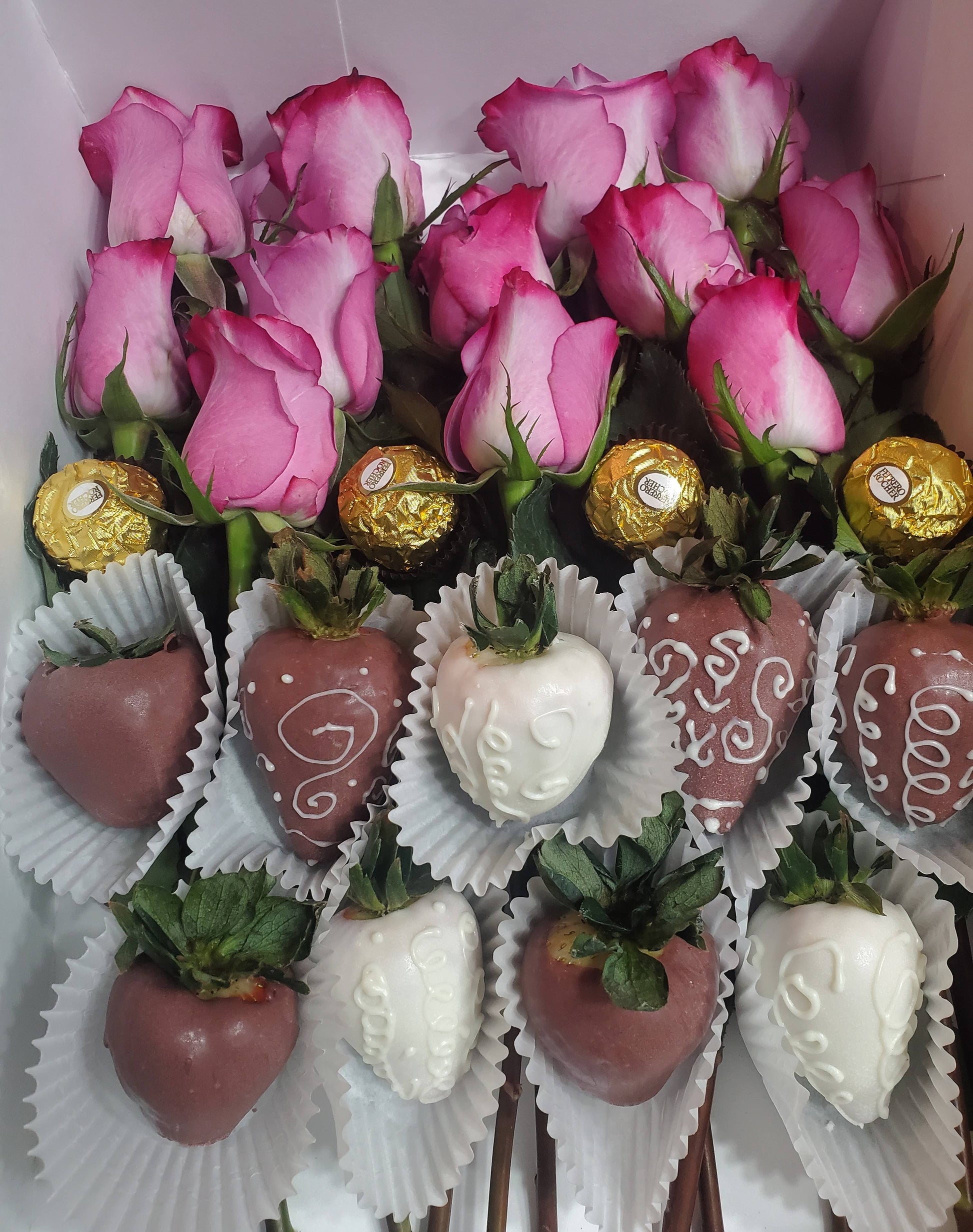 Are you looking to make a big impression for any special day? Look no further. Our Big Strawberry Rose Box contains a dozen luxury roses and the sweetest chocolate-dipped strawberries, along with Ferrero Rocher chocolates all arranged in a unique box for that special someone. If you’re looking for something truly romantic, you can’t go wrong with this special gift. This gorgeous box comes with 12 roses with baby breath, 4 pcs of Ferrero rocher chocolates, 8 pcs of chocolate-covered strawberries. Please be advised that coconut oil is used in this product. The size of this box is 14 x 10 1/2 x 3 1/2 .